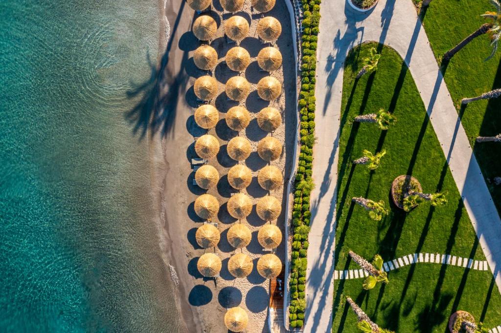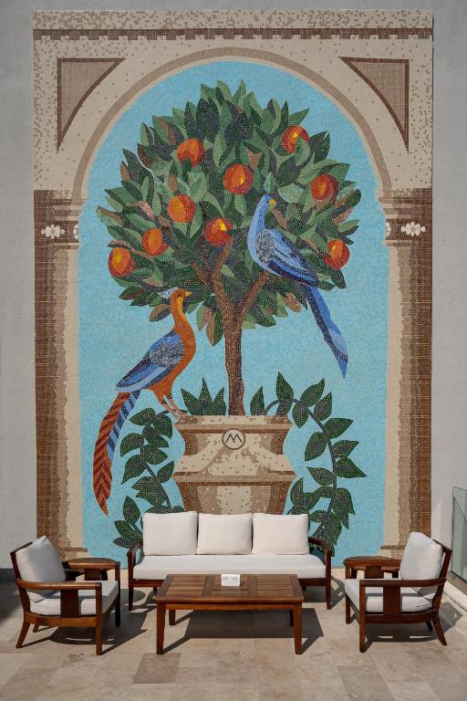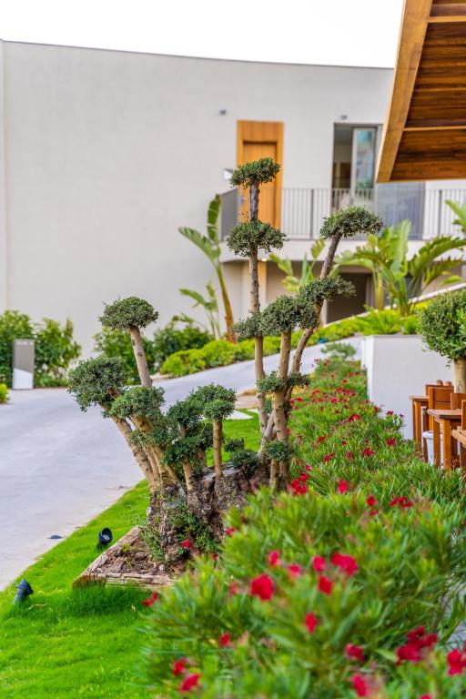 باغهای گرمسیری، درختان زیتون و نخل، و مسیرهای چوبی بین ساختمانها، حس یک روستای ساحلی مدرن را تداعی میکند. همهچیز از ابتدا تا انتها با وسواس چیده شده: از نورپردازی گرفته تا موسیقی ملایم در لابی، از بوی خوش محیط تا رنگهای خنثی در دکوراسیون.