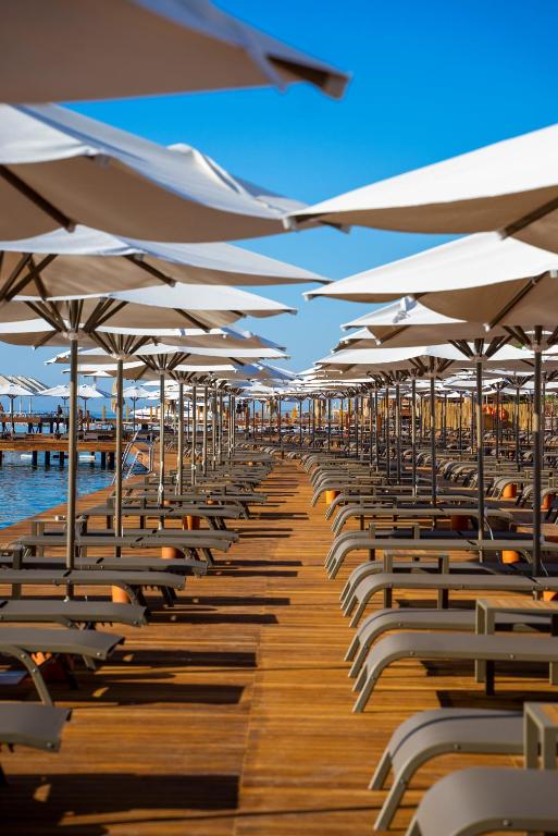 ساحل اختصاصی هتل با شن طلایی، تختخوابهای ساحلی و اسکلهی چوبی، مکانی بینقص برای استراحت زیر آفتاب یا تماشای غروب است.