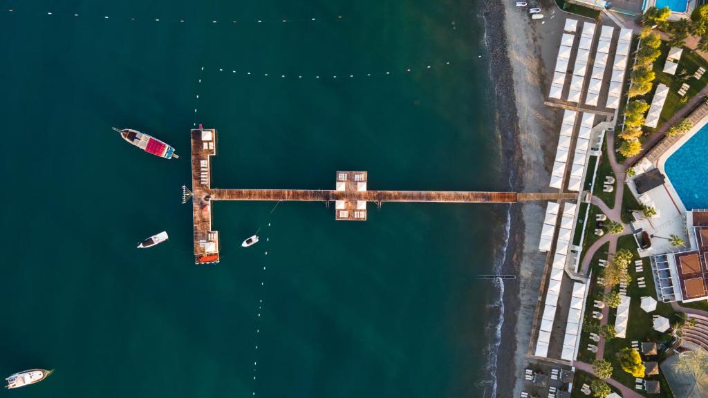 هتل در حاشیهی فتحیه و کنار ساحل قرار دارد؛ جایی که بوی دریا با عطر رزین کاج قاطی میشود. فاصلهاش تا مرکز شهر بهاندازهای است که هم از شلوغی دور بمانید و هم در صورت هوس گشت شهری، با مسیر کوتاهی خودتان را به بازار، کافهها و اسکله برسانید. مزیت بزرگ موقعیت، افق وسیع آب و دسترسی بیواسطه به ساحل اختصاصی است؛ یعنی صبحها پیادهروی روی ماسه و عصرها تماشای غروبهای نارنجی، بدون نیاز به برنامهریزی پیچیده.