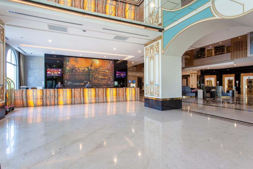 لابی باشکوه با ستونهای بلند، لوسترهای عظیم و طراحی کلاسیک.
