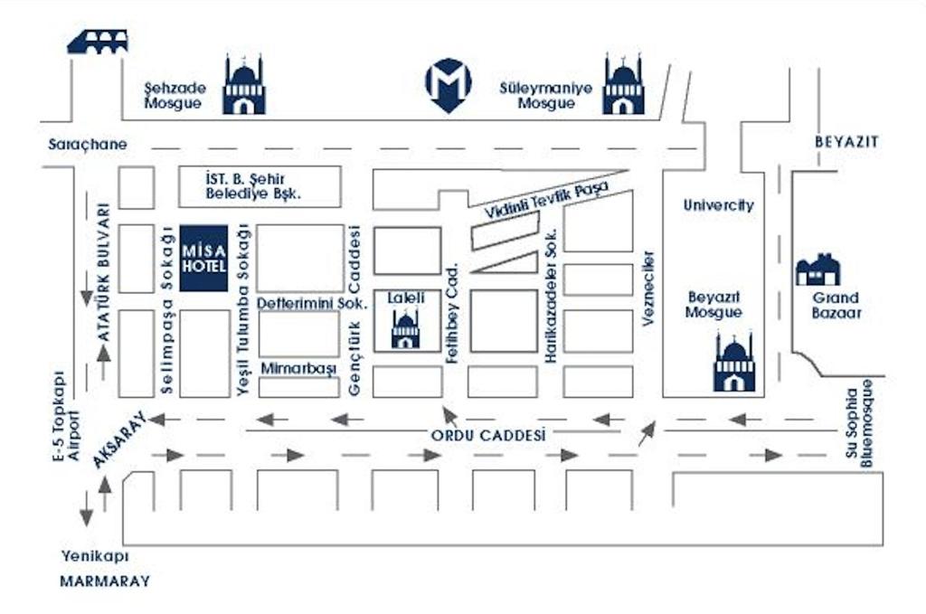 هتل Misa Hotel در منطقه لالالی استانبول، که یکی از مناطق مهم و تاریخی شهر است، واقع شده است. لالالی بهعنوان یک محله شلوغ و پرجنبوجوش با بازارها، مغازههای پوشاک، و رستورانهای متعدد شناخته میشود. این منطقه نه تنها دسترسی راحت به مسجد سلطان احمد، کاخ توپکاپی و ایاصوفیه دارد، بلکه از نظر حمل و نقل عمومی نیز در موقعیت خوبی قرار دارد. ایستگاههای مترو و تراموا در نزدیکی هتل قرار دارند که به شما این امکان را میدهند تا به راحتی به دیگر بخشهای استانبول دسترسی پیدا کنید.