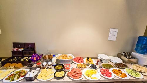 صبحانه بوفهی مفصل شامل: انواع نانهای تازه، شیرینیهای محلی گرجی، املت، انواع پنیر، مرباهای دستساز، ماست خانگی، میوههای تازه، چای و قهوه