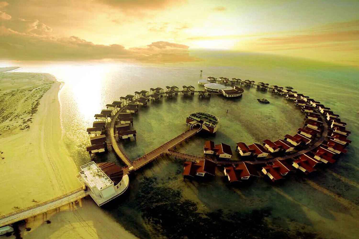 یکی از ویژگیهای برجسته هتل ترنج کیش، معماری منحصر به فرد آن است. این هتل بهطور کامل در آبهای دریای خلیج فارس قرار گرفته و طراحی آن بهگونهای است که برخی از اتاقهای آن بر روی آب ساخته شدهاند. این ویژگی به هتل ترنج جنبهای خاص و جذاب بخشیده و تجربهای بینظیر از اقامت در یک هتل دریایی را برای مهمانان فراهم میآورد. اتاقهای هتل با استفاده از شیشههای بزرگ و نمای پانورامیک، امکان دیدن منظره دریا را برای مهمانان فراهم میکنند.