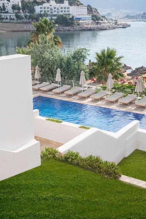 ساحل اختصاصی هتل با تختهای آفتابگیر چوبی، سایهبانهای سفید و بار ساحلی، در یکی از آرامترین خلیجهای بدروم قرار گرفته. آب این قسمت از دریا شفاف، بیموج و ایدهآل برای شناست.