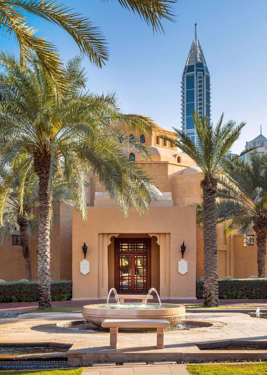 این هتل در منطقهی ساحل جمیرا و روبهروی خلیج فارس قرار گرفته و یکی از معدود هتلهایی است که یک کیلومتر ساحل اختصاصی دارد. ۶۵ هکتار باغ سرسبز، نخلستانها و محوطههای باز باعث شده مهمانان حس کنند در یک قصر خاورمیانهای زندگی میکنند؛ در حالی که فاصله کمی تا مراکز تجاری و تفریحی مدرن دبی دارند.