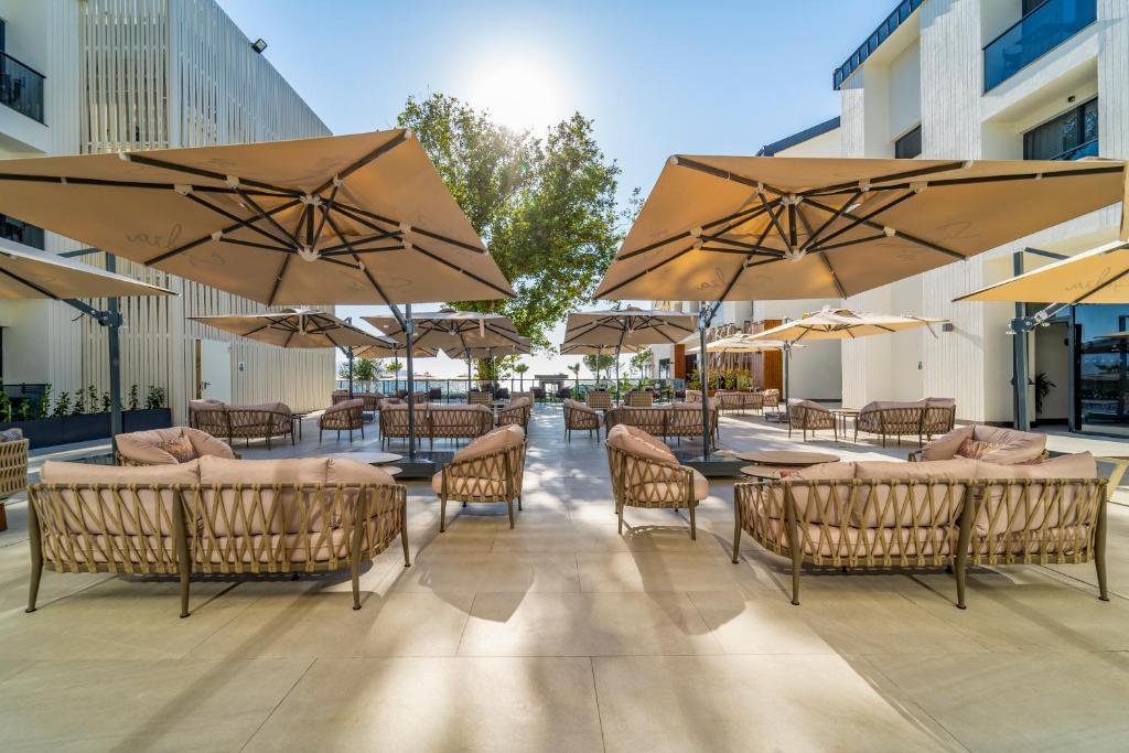 یکی از اولین چیزهایی که در بدو ورود جلب توجه میکند، طراحی مدرن و مینیمال هتل است. ساختمانها با شیشههای بلند و خطوط هندسی طراحی شدهاند تا نور طبیعی را به بهترین شکل وارد فضا کنند. رنگهای سفید، کرم و خاکستری در کنار عناصر چوبی و سنگی فضایی آرامشبخش ساختهاند. استفاده از بالکنهای بزرگ و تراسهای وسیع باعث شده مهمانان همواره در ارتباط مستقیم با دریا و طبیعت اطراف باشند.