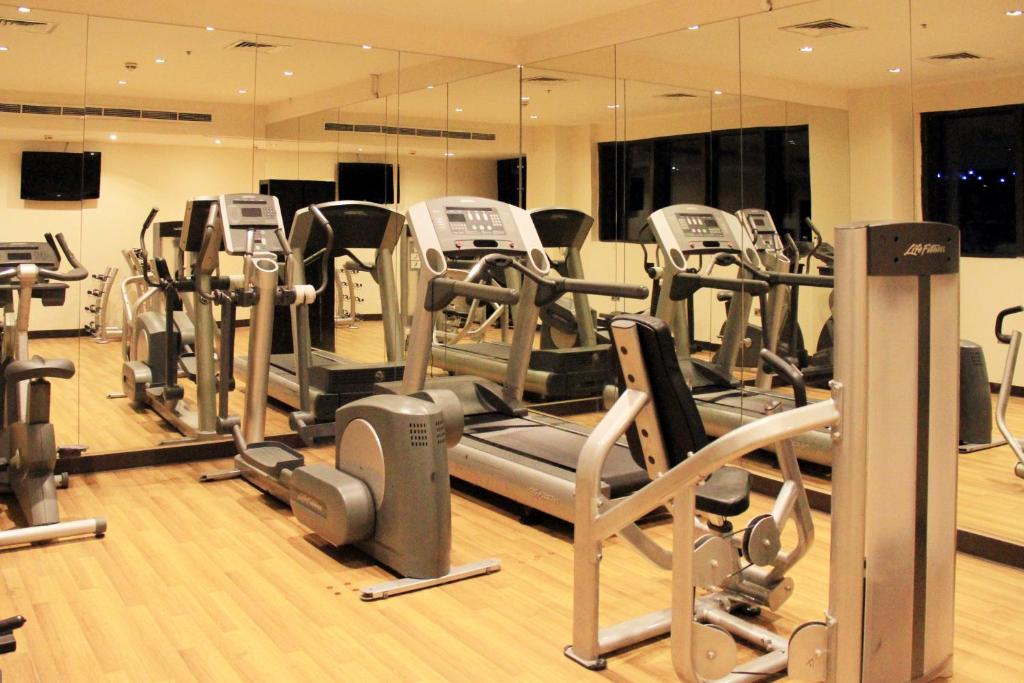 باشگاه بدنسازی مجهز با تجهیزات مدرن و فضای باز رو به چشمانداز شهری.